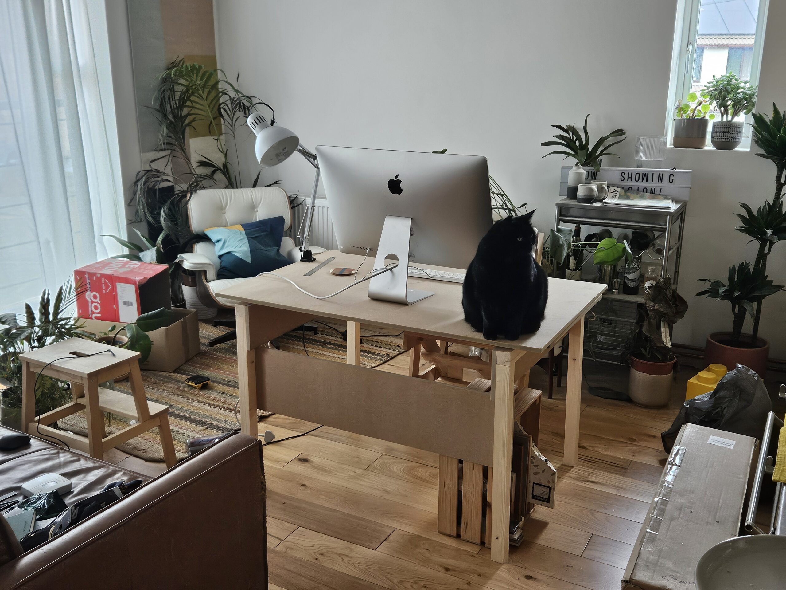 A travel desk was also constructed from offcuts of untreated mdf boards fixed through to cheap lengths of stud timber, held together with a series of screws allowing the whole piece to be dismantled and wrapped in bungee cord to travel using public transport.