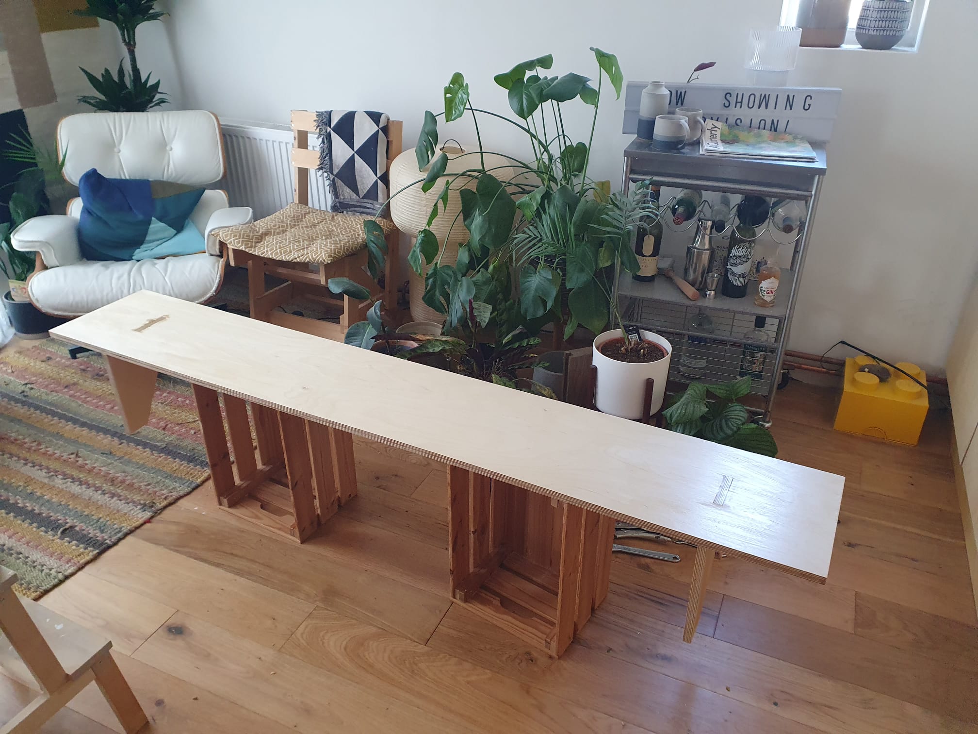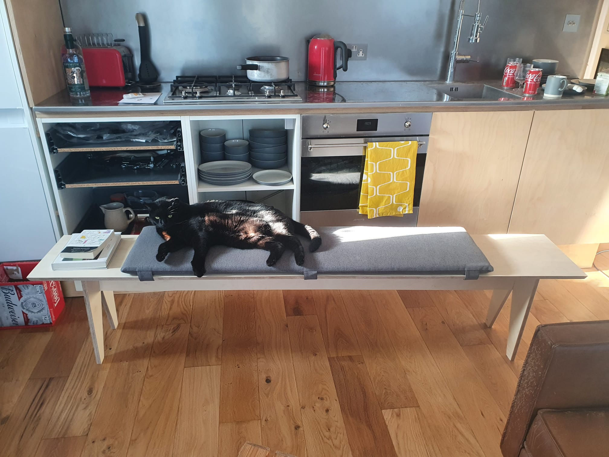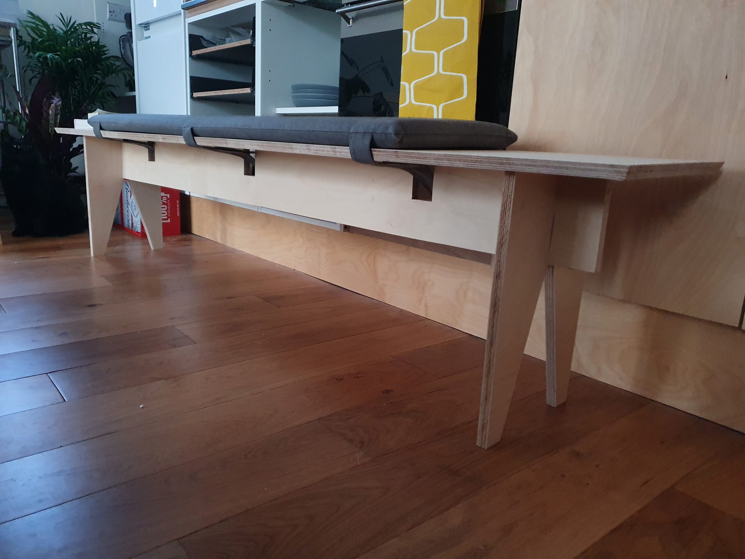 Including a bench was conceived to fit a standard size of cushion, made from a single sheet of typical plywood and slotted together with no permanent fixings. The cushion finishes short either end allow to space to leave glasses and books, or fit normal-sizzed decorative cushions for further seating.