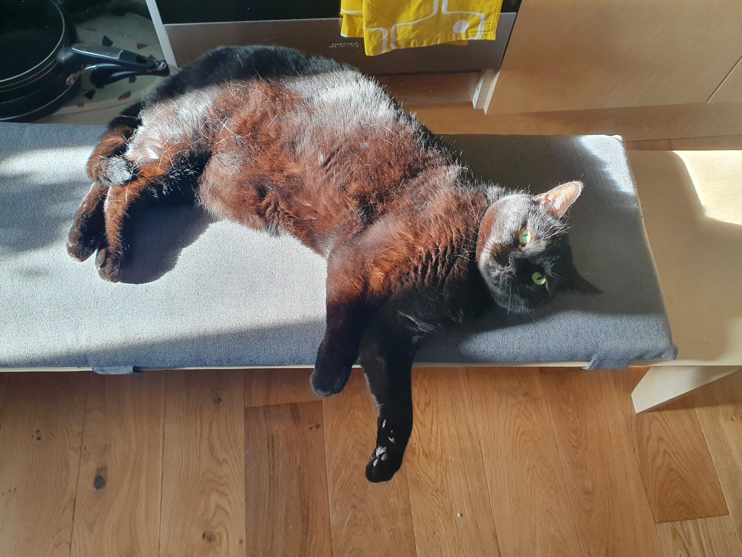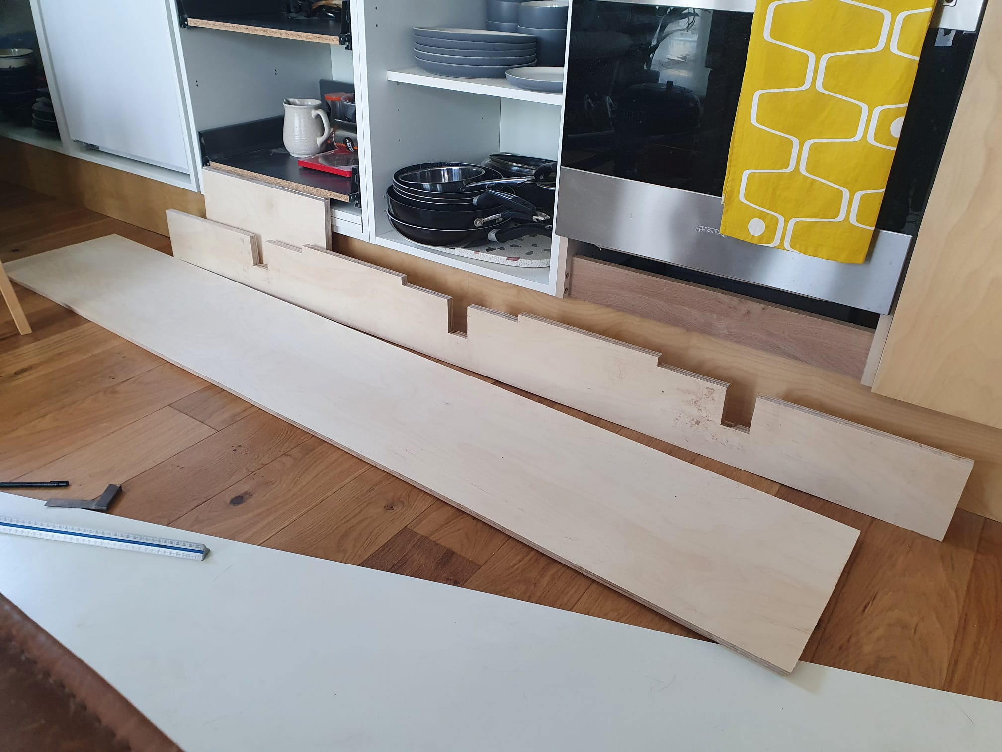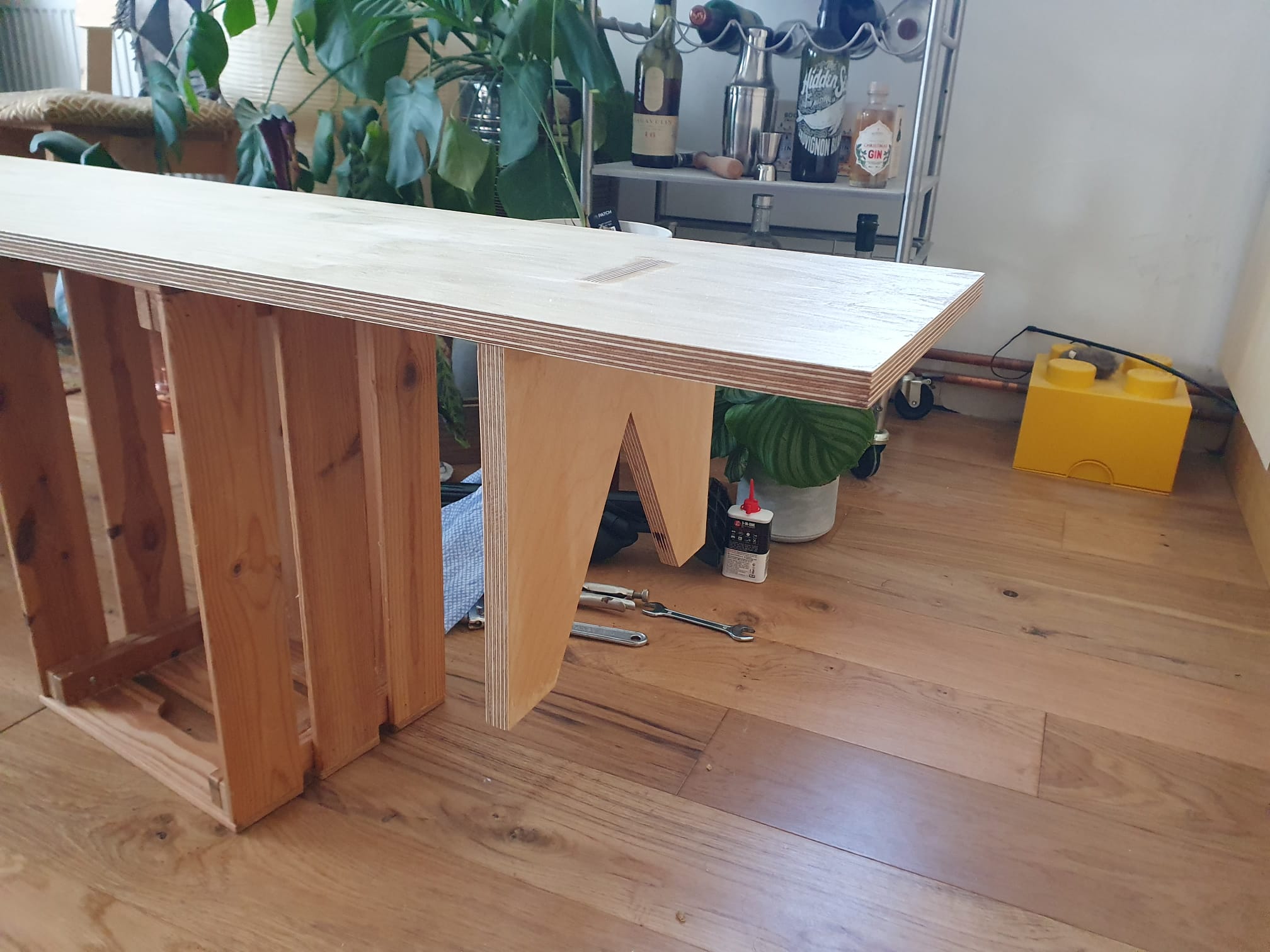Including a bench was conceived to fit a standard size of cushion, made from a single sheet of typical plywood and slotted together with no permanent fixings. The cushion finishes short either end allow to space to leave glasses and books, or fit normal-sizzed decorative cushions for further seating.